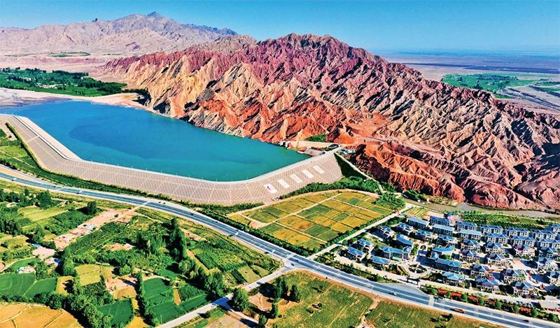 黨的十八大以來,經過頑強努力,我國天更藍、地更綠、水更清,萬里河山更加多姿多彩。圖為2023年6月15日,甘肅省張掖市臨澤縣的紅山灣水庫與丹霞美景構成一幅“戈壁水鄉”生態和諧絢麗多彩的畫卷。人民圖片 王將/攝